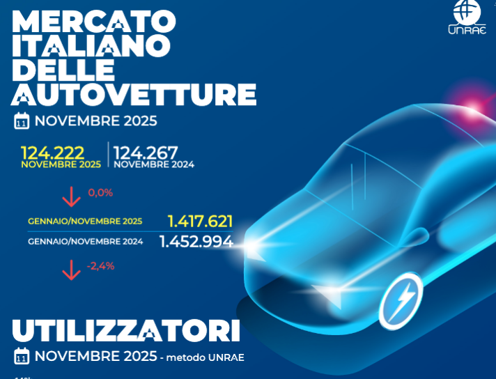 Il mercato italiano delle autovetture resta fermo nel mese di novembre con 124.222 unità immatricolate rispetto alle 124.267 unità dello stesso mese del 2024.