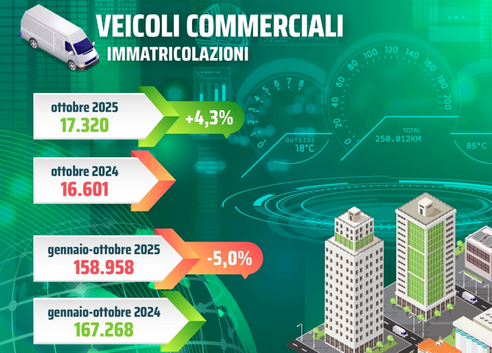 Il mercato dei veicoli commerciali leggeri ha registrato a ottobre un andamento positivo: +4,3% (17.320 unità) vs le 16.601 dello stesso mese del 2024.